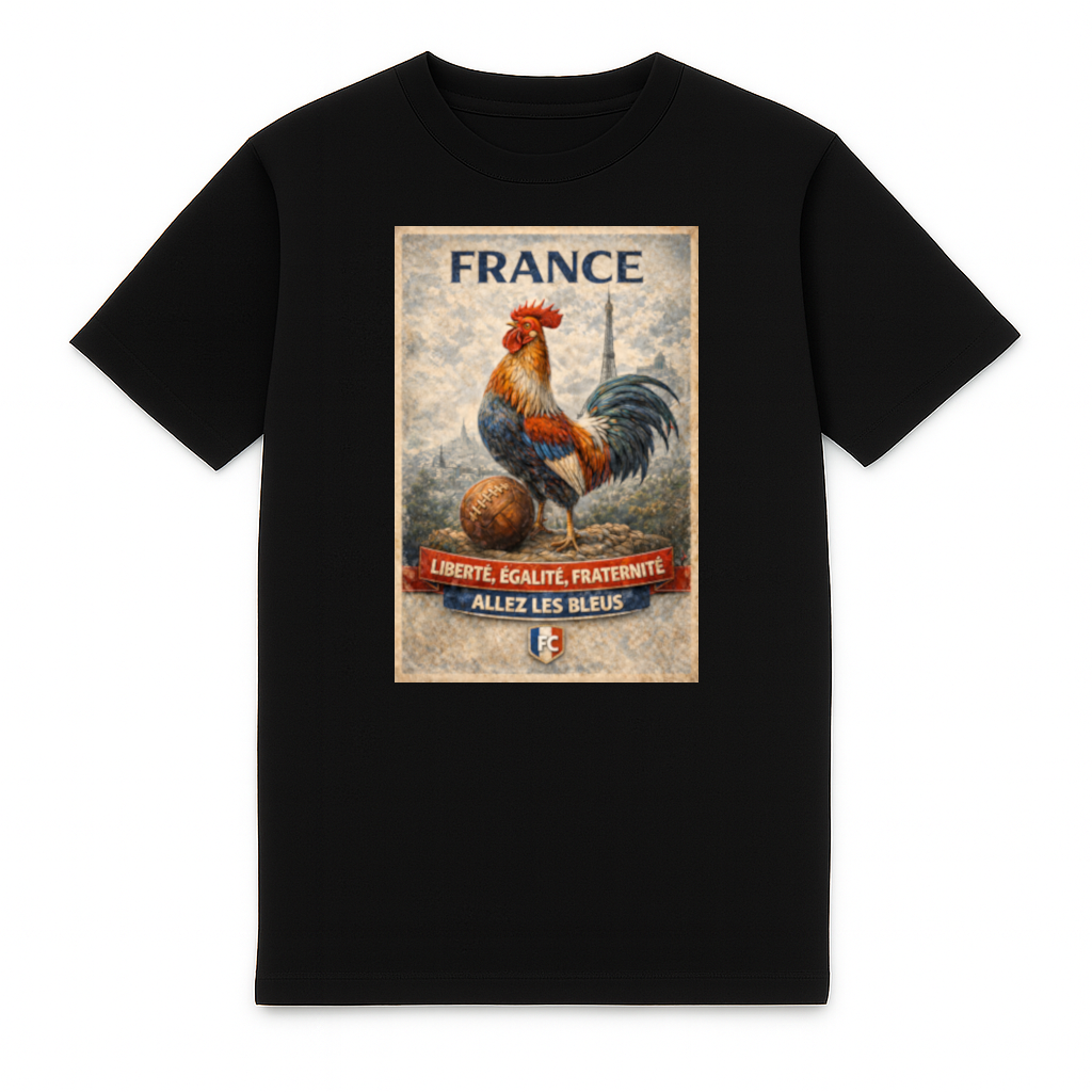 T-shirt heavy France élégant de FC ELEVEN pour adultes. Ce t-shirt heavy est fabriqué en coton biologique épais. Le dos du t-shirt présente une impression d’un bouclier avec une image 3D du célèbre coq français accompagné d’un ballon de football rétro. L’impression est entièrement réalisée dans les couleurs nationales de la France: bleu, blanc et rouge. Elle contient également les textes Liberte, Egalite, Fraternite et Allez Les Bleus. Spécialement conçu pour encourager l’équipe nationale de France.